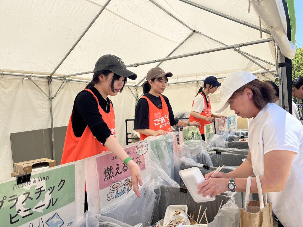 ごみ箱の前に立ち、ごみを捨てにきた来場者に対して分別を呼びかけます。